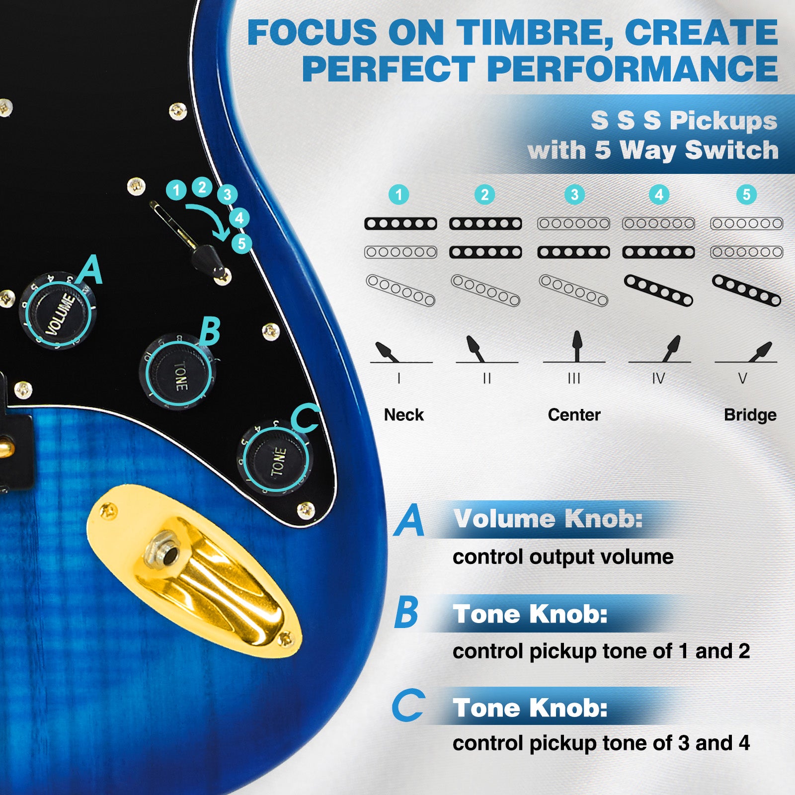 - Customize Your Music - Premium rosewood fingerboard, Canadian maple neck, S-S-S pickups, volume and tone controls, tremolo bridge system and removable whammy bar. The maple fingerboard and steel strings provide fantastic feel and smooth tone. Perfect for beginner and intermediate players.