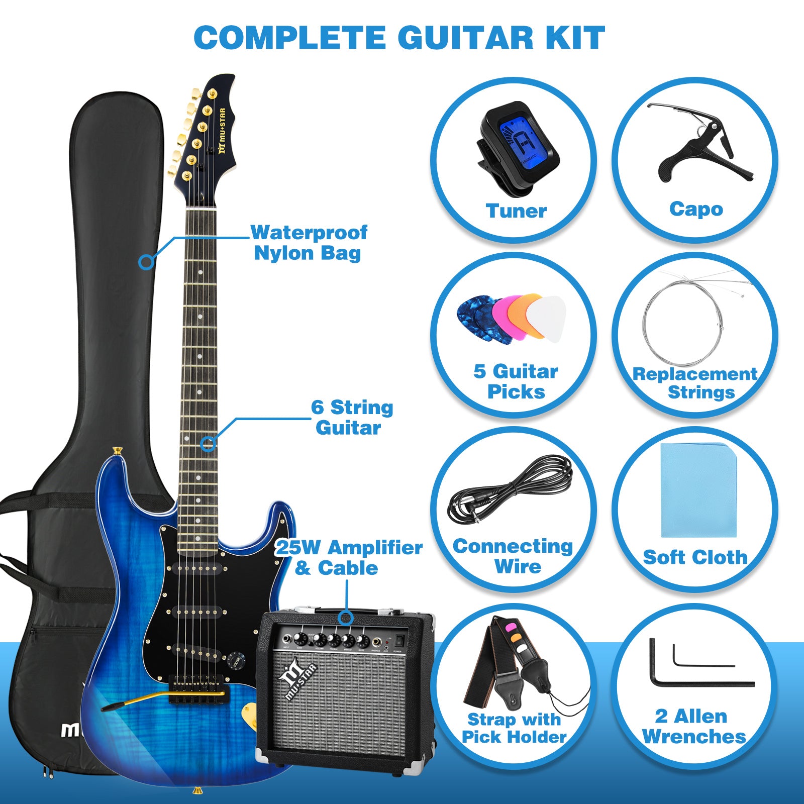- All-in-one Kit & Ready To Play - Everything you need to become the next guitar star is here: 1 x 39-inch electric guitar, 1 x 25-watt amplifier, 1 x cable, 1 x gig bag, 1 x electronic tuner, 1 x capo, 1 x shoulder strap, 1 x extra strings, 5 x picks, 2 x wrenches and 1 x cleaning cloth. Start rocking right out of the box!
