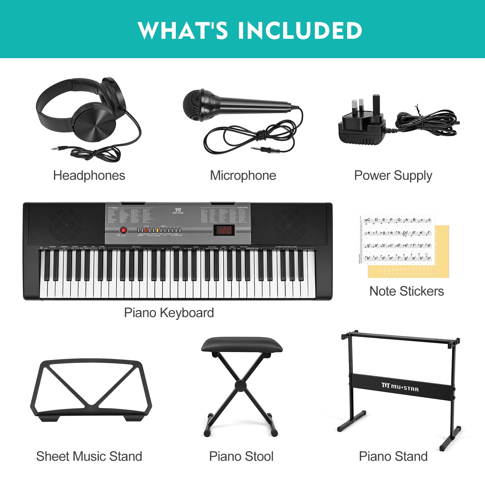 - Rich Music Selections - MUSTAR learning keyboard is newly designed with two power supply methods (adapter and battery power), whether you are practicing at home or partying outdoors. Connecting the microphone into the MIC port of the piano, allows you to sing and play the piano at the same time. Keynote stickers are also included to help build muscle memory and provide a visual reference as you try to find the right note.